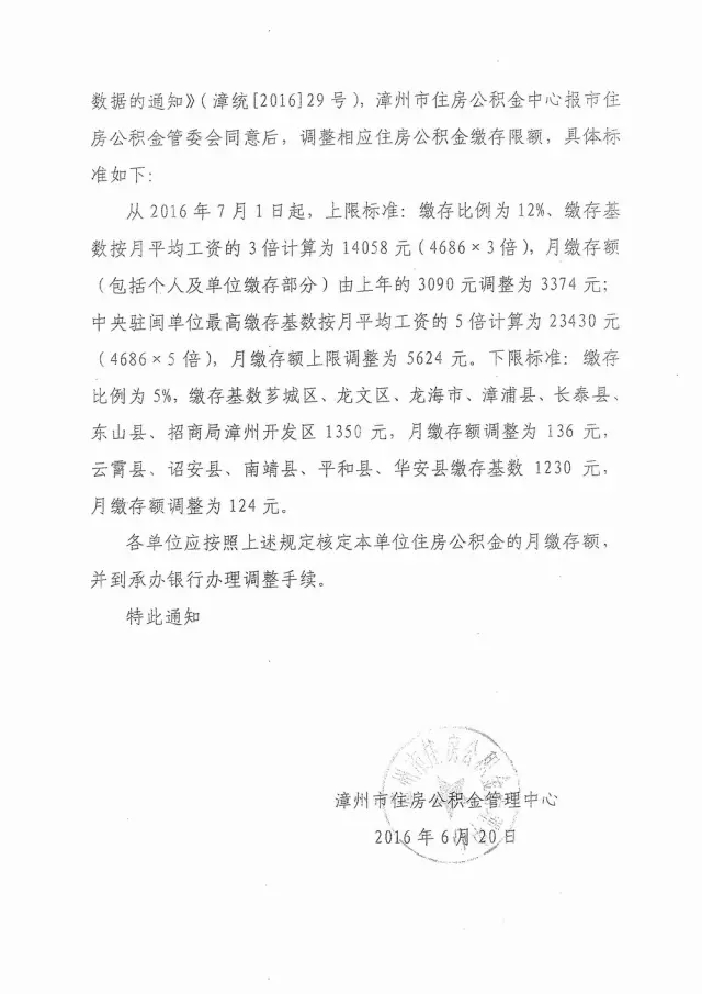 下限標準:繳存比例為5%,繳存基數(shù)薌城區(qū)、龍文區(qū)、龍海市、漳浦縣、長泰縣、東山縣、招商局漳州開發(fā)區(qū)1350元,月繳存額調(diào)整為136元。云霄縣、詔安縣、南靖縣、平和縣、華安縣繳存基數(shù)1230元,月繳存額調(diào)整為124元。